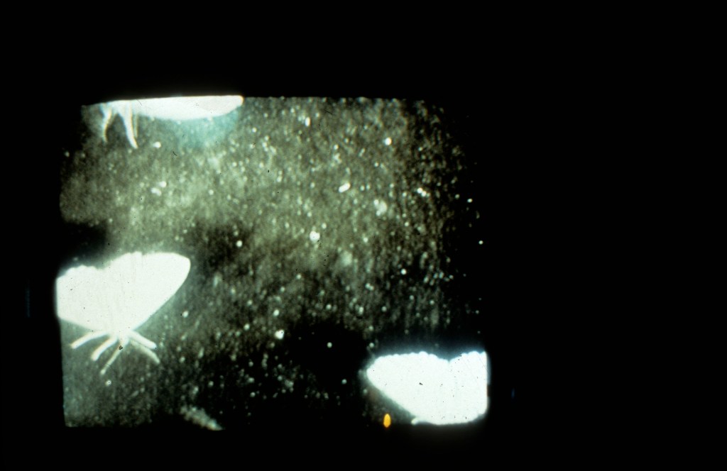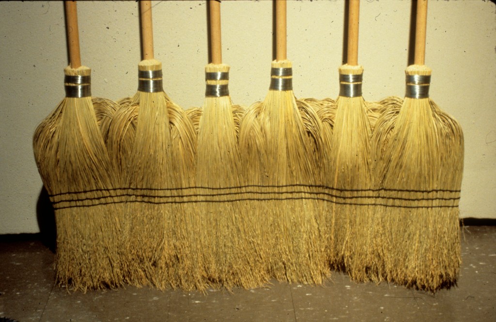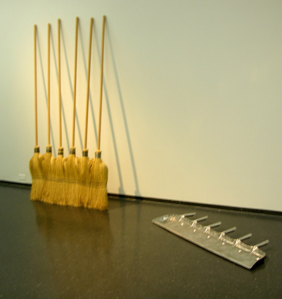 Leaning against a side wall, the six-handled broom and dust pan are an absurd expression of the shared maintenance of habitable space. Projected on the back wall, the culminating image of hands shaking moths from a blanket underscore the individual’s persistent attempt to fend off decay. Like the collective maneuvering of a six-handled broom, it is at once a suite and hopeful gesture representing our desire to adapt in the face of change.
