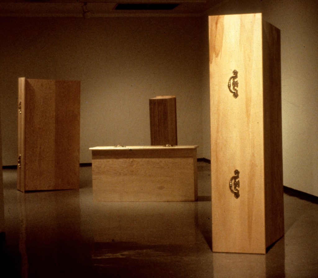 One enters the piece by walking among a series of solid life-sized drawers toppled from a nonexistent chest. Their cavities blocked, the drawers suggest an absence of useable space. Denying their function as containers of personal belongings, they posit the illusory nature of a unique and private self.