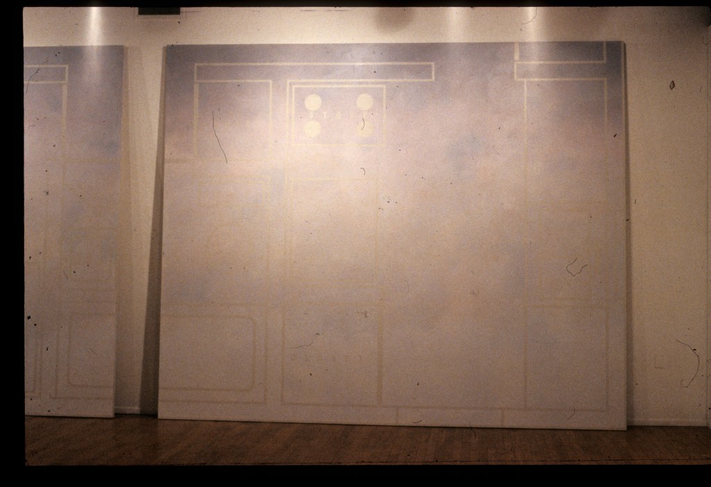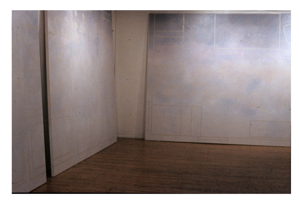 On a trip to New York City, a friend and I contemplated the huge paintings of Julian Schnabel at Pace Gallery. She asked me whether one of those paintings might be the size of my small house in Flint. This question inspired me to make four 10 x 12-foot paintings of the outline of my 20 x 24-foot house. Outlines of the position of the furniture and appliances appear against a background of sky.