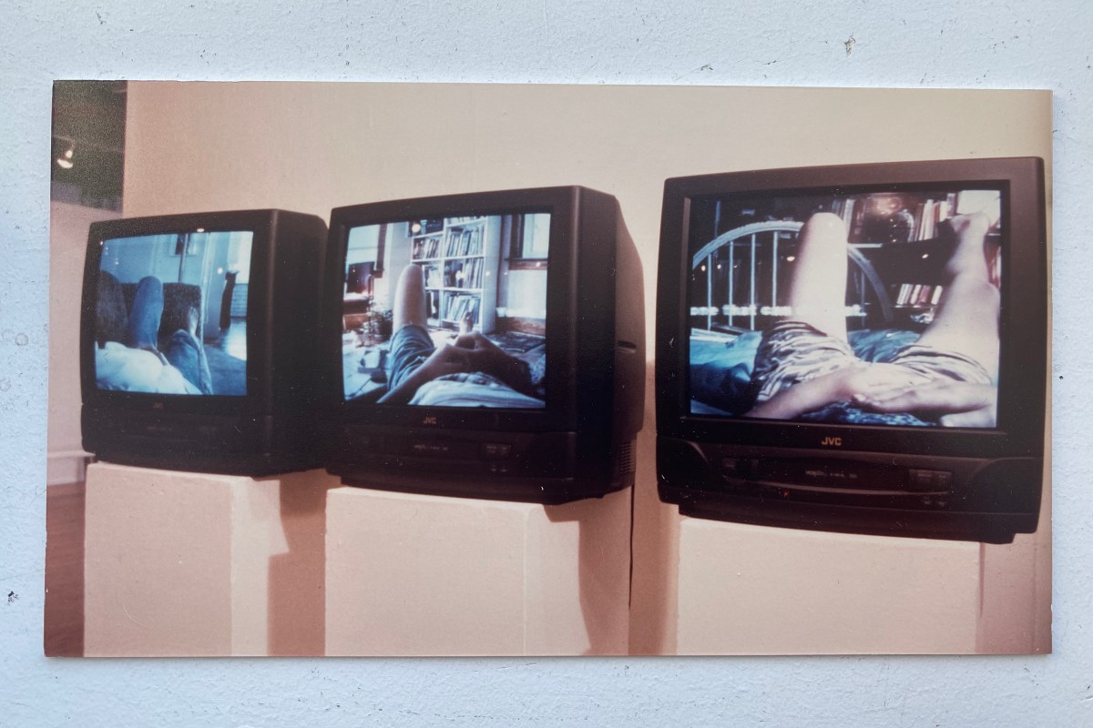 This is the last in a group of collaborations with women I studied with at the School of the Art Institute of Chicago. By this time we were scattered throughout the country: Cathy Gasser was in Kansas; Melissa was in New York; I was in Michigan. The internet was in its infancy though we did communicate through email. Each of us videotaped ourselves stressed out on a comfortable couch or bed. We had taped a conversation we had the previous summer when we were together in New York City. The piece consists of three monitors with the images of each of us and the conversation in text ran across the bottom of the screens. This piece was exhibited in Kansas, Michigan and Illinois.