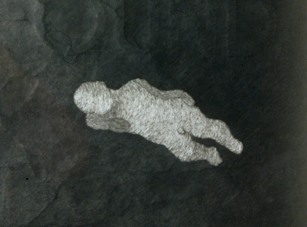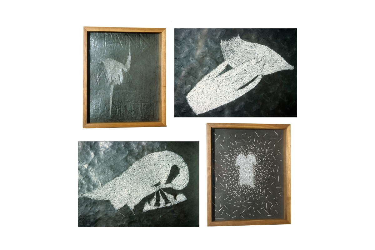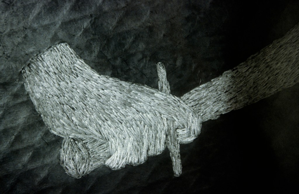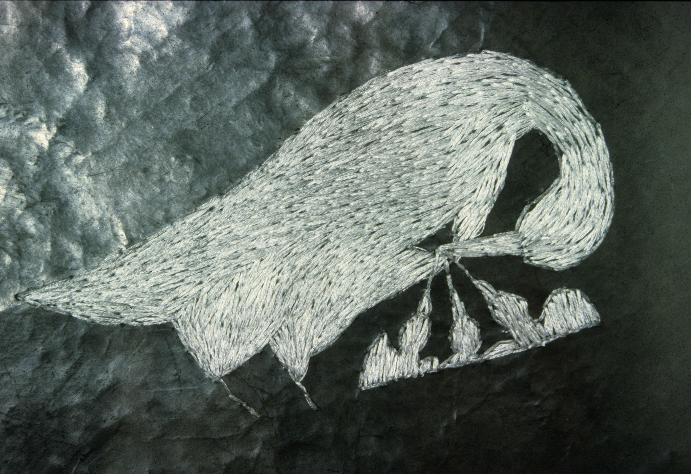 The process itself satirizes the female occupation of embroidery. The paper ground has been layered with alternating applications of graphite pencil and oil pastel until a rich solid surface is built up. The white floss is stitched roughly and, rather than being pristine, has become soiled during the work process.