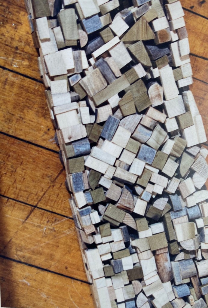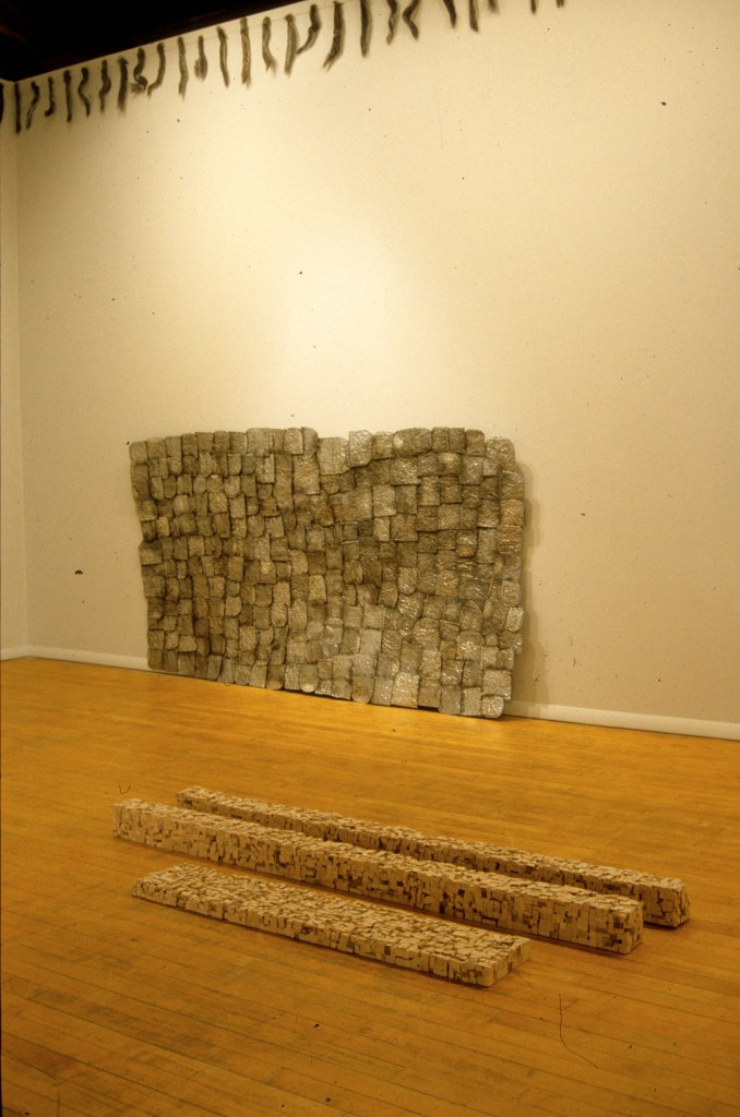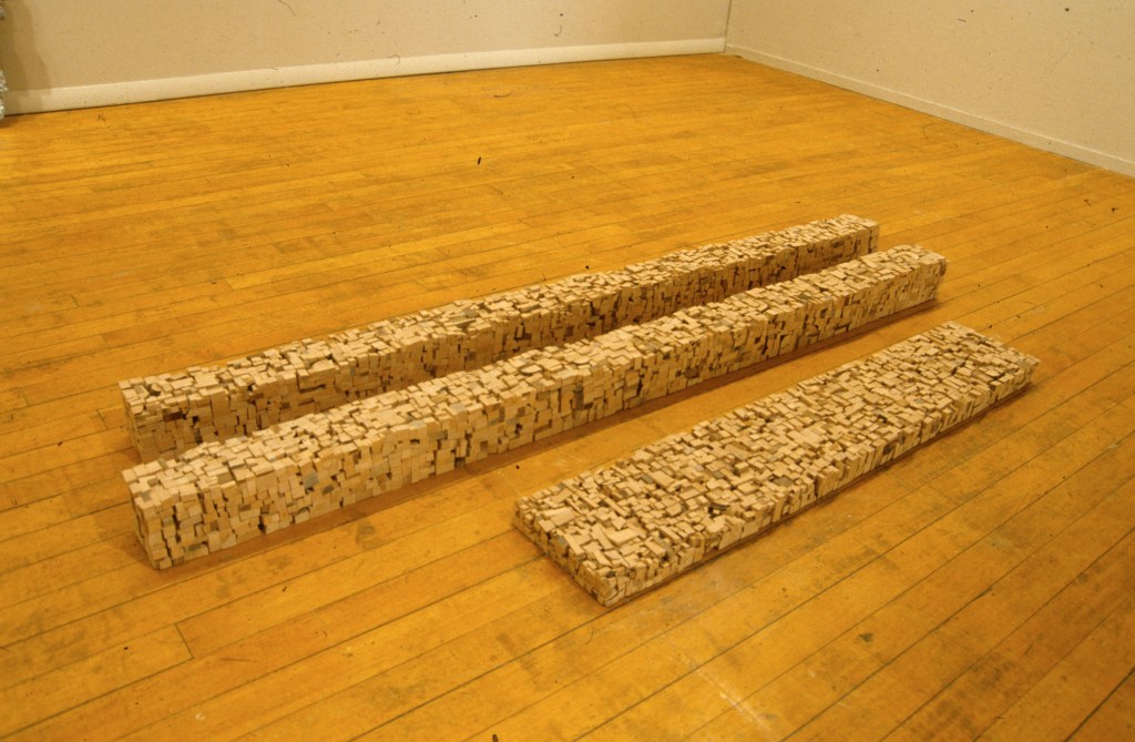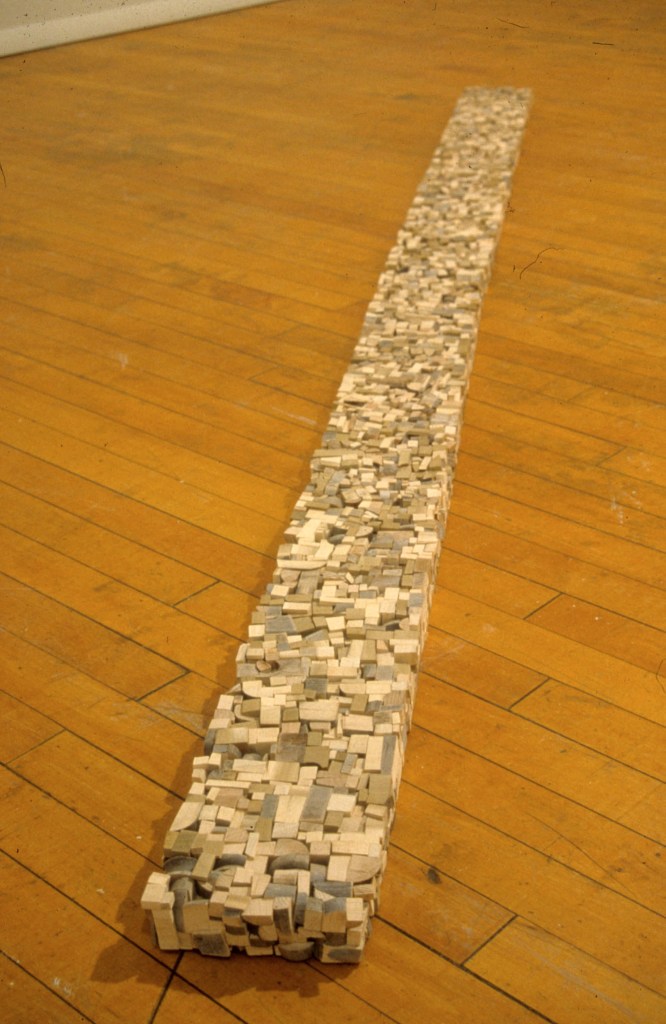 The original impetus for the “unmade” pieces came from an attempt to recreate an event from my childhood. To represent objects from the past, it occurred to me to move the objects back in time by reshaping them into their previous states. I cut apart an old wooden chair and a table with a worn finish and glued them back together into 4 x 4s and 2 x 6s. I crushed tin cans from the recycling bin under the wheels of my car, flattened them between heavy steel plates, and then soldered them together into a sheet of metal. I liked the way the objects were transformed, not just because they had appealing textures and forms, but because of the way the meaning had changed. They become at the same time about the past (memory) and about the future (death). Because all the space had been compressed and obliterated from the objects they once were, they were also about loss.