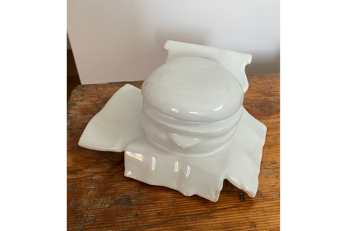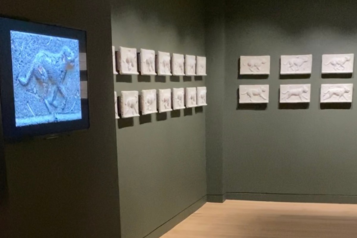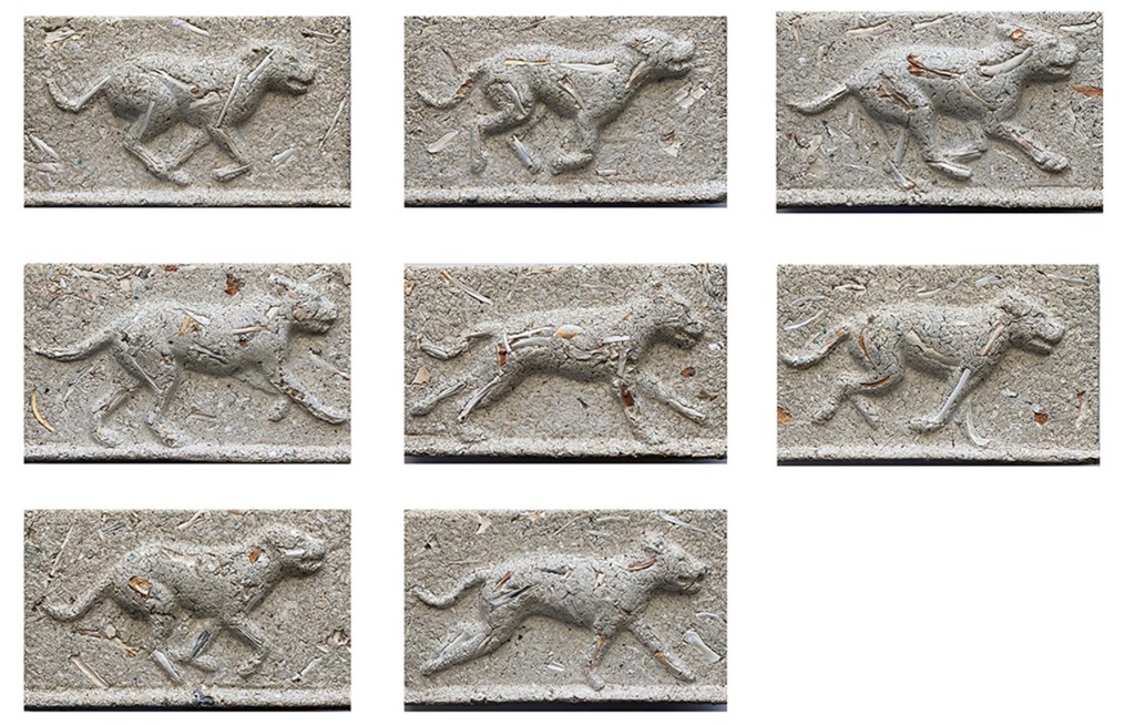 In 1887, Eadweard Muybridge, better known for his images of racehorses running at full speed, completed his series of Dread, an English mastiff, engaged in a typical lumbering run. By setting up cameras at regular intervals, he was able to capture the dog’s even gait. Dread Running: A Memorial to Lost Dogs is comprised of 48 reliefs using Muybridge’s eight images as an inspiration for the implied movement. Each piece is made from the remains of shelter animals. The ashes and bones–retrieved from the waste bin–have been mixed with a clear glaze and fired in a kiln to fix the shape. Like Victorian hair wreaths, the individual pieces are relics of lost lives. When combined they form a memorial to honor these animals—some old, some newly born, some unwanted and some lost but once loved ferociously.