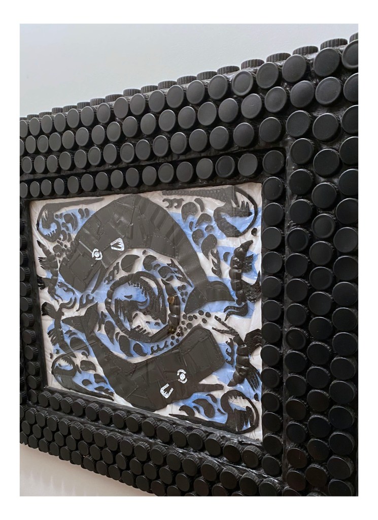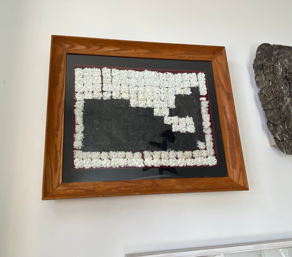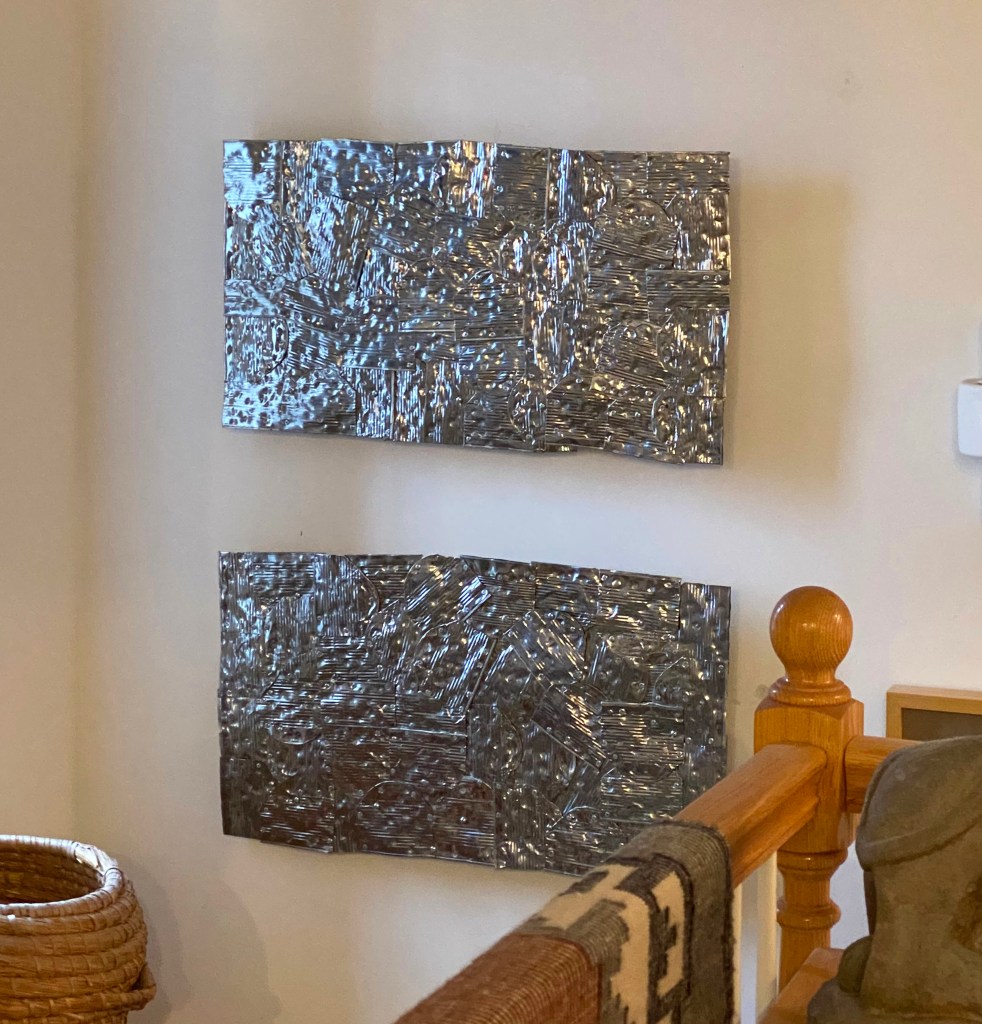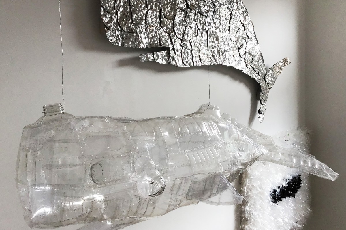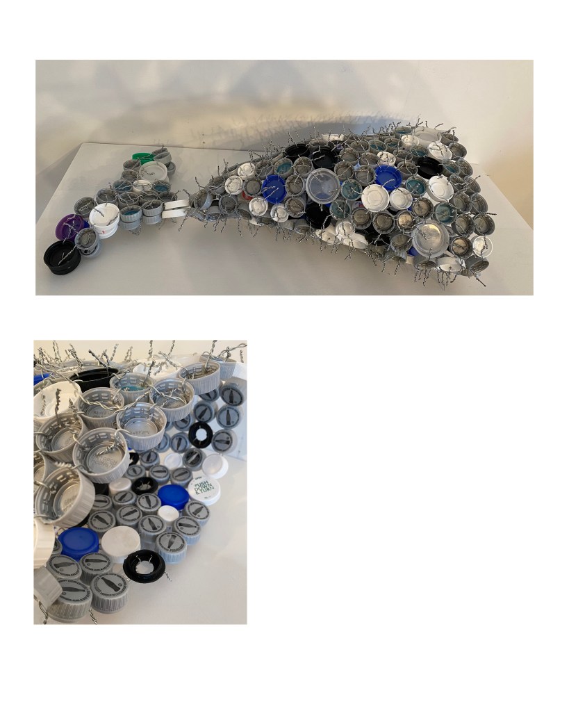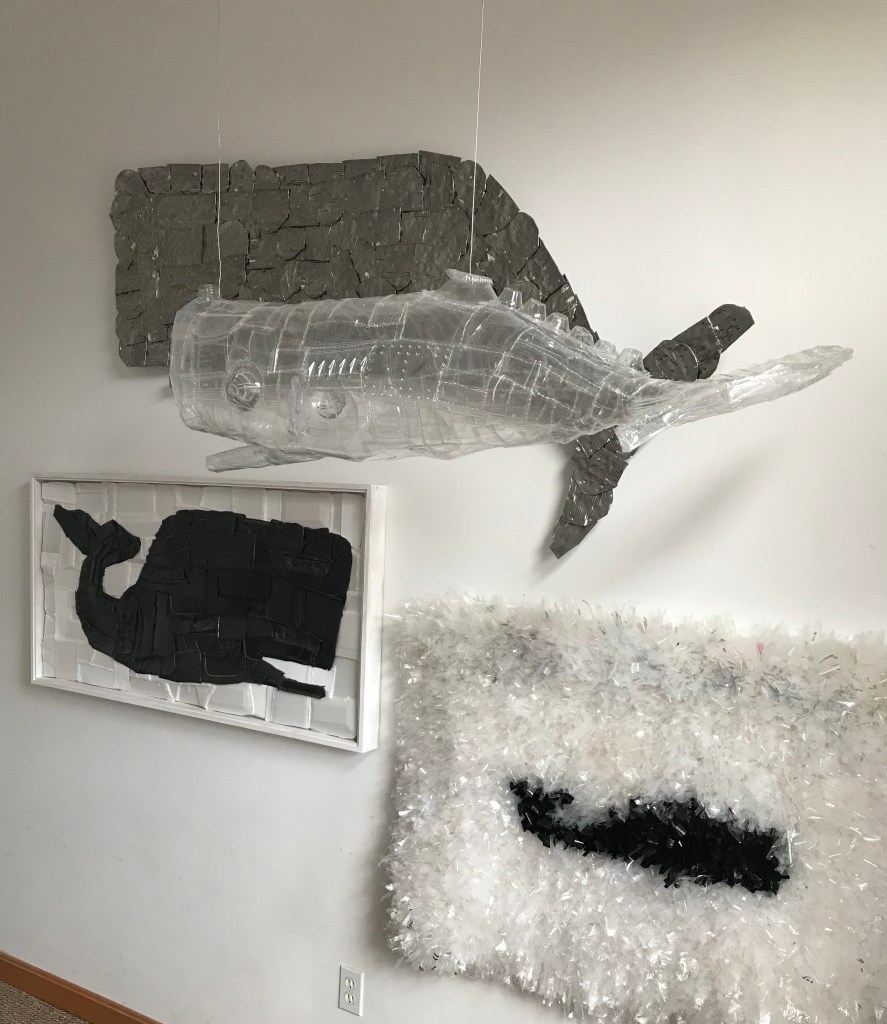 This project started in response to the now all-too-common sight of a dead whale washed up to shore with a belly full of plastic. As one of many who have been horrified by this sight, I decided to try to eliminate plastic from my life as well as save and make art out of that plastic which I could not avoid buying. After only a few days of collecting my refuse and carefully washing, drying and storing it, it became clear that this useless rubbish, when multiplied by millions of earth’s inhabitants, added up to a staggering amount of non-earth-friendly material. From the wrapping covering the cans of dog food I ordered online, to the maddeningly difficult-to-open containers for hardware items, to the pervasive use of plastic wrap for foods in the grocery store, it seemed impossible to avoid this ubiquitous material. Thanks to many online resources by like-minded individuals, I slowly found new ways of living without plastic. Eliminating coffee pods in favor of coffee poured through a stainless steel cone, sewing muslin bags to use at the grocery store, buying glass containers to store food in, and returning to using bar soap are some strategies we can all embrace. I am not perfect and still struggle to find new ways to change my old habits.