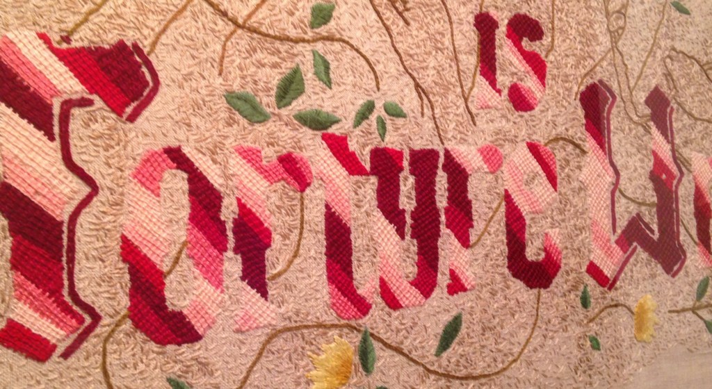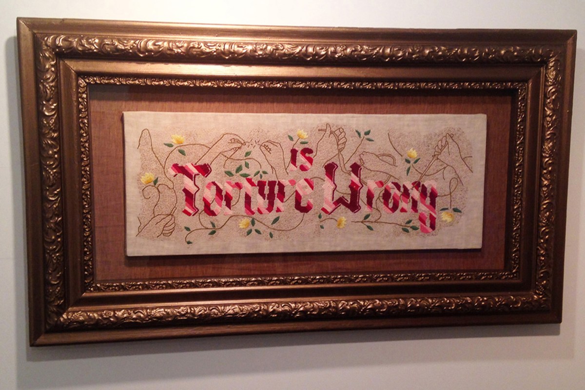 Completed in 2015, Torture is Wrong presents the viewer with a “universal truth,” assumed to be believed by everyone who lives in a free and democratic society. After the revelations of abuse at Abu Ghraib in the early 2000s, many Americans were confronted with an ugly truth. Some leaders and citizens had abandoned (and continue to abandon) a higher morality. The piece is made in the Victorian/Edwardian style of women’s needlework. Historical evidence exists of political statements made in this form in the embroideries of Janie Terrero and others who were imprisoned in Britain in 1912 for their acts as suffragettes. We are fortunate that we can speak out without suffering the indignities and cruelties meted out to those of our sisters who fought for our right to speak. Today, artists regularly honor women of the past by using embroidery and other fiber arts to make cultural, political and personal statements.