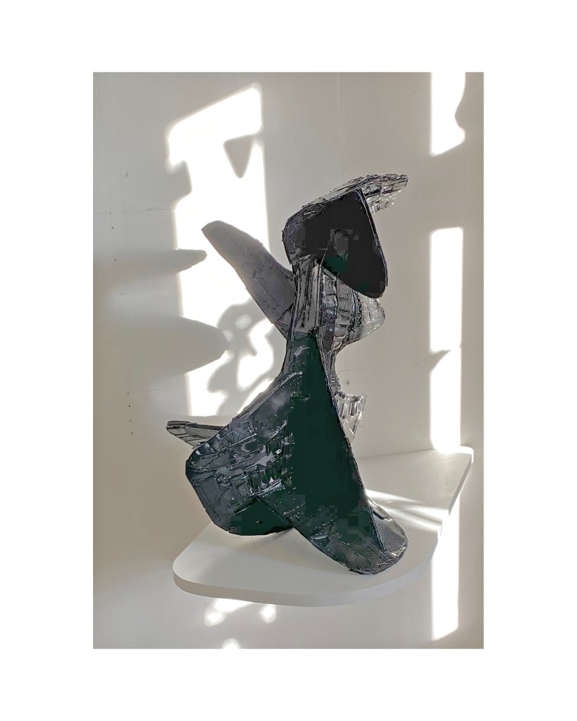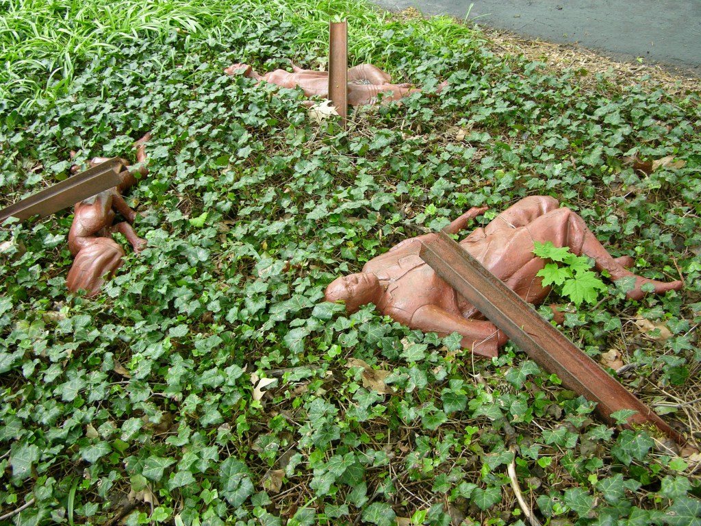 The figures where modeled in clay as two-thirds life-sized portraits of three distinct individuals. Started over eight years ago when the three studied art at Mott, these representations mark a transition for each. They have since gone on to their adult lives. This piece represents my fears for them as they mature in an environment filled with high unemployment and crime rates.