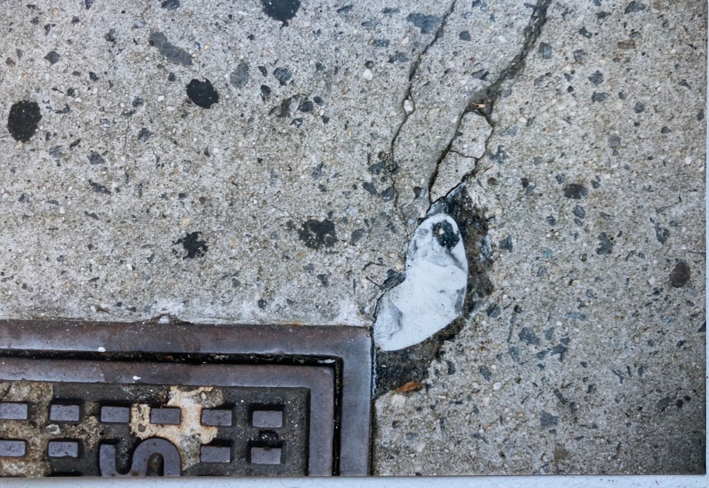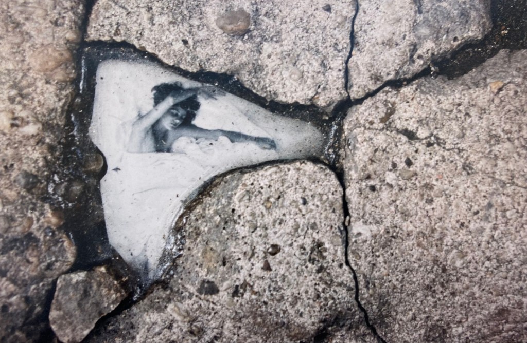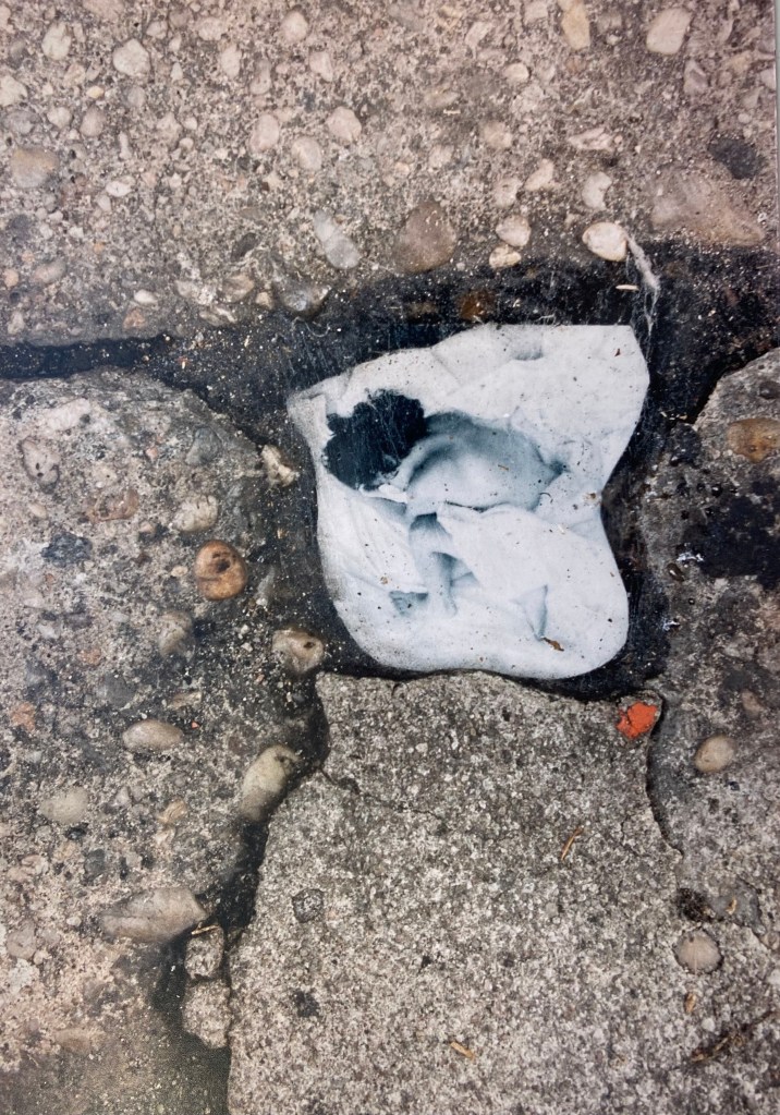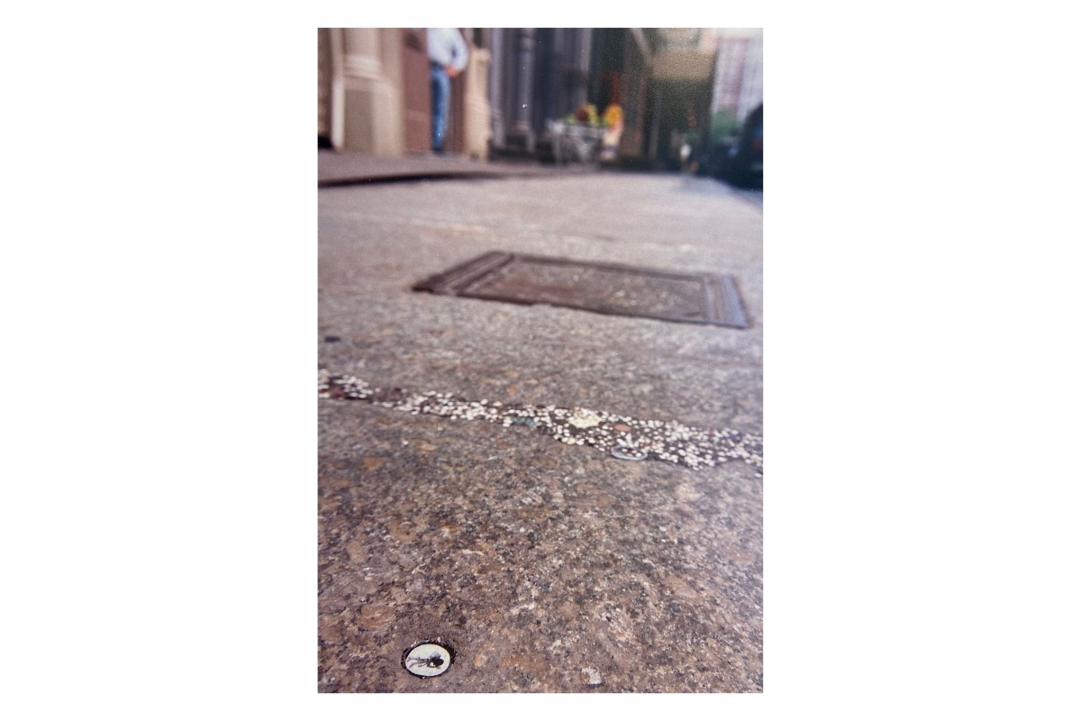 Over two summers in New York City, we embedded hundreds of small photographs into cracks and holes in the cement sidewalks of Soho. By photographing ourselves in peaceful recumbent positions wrapped in white sheets, we recorded on film the intimate act of sleeping, then exposed those images to the harsh realities of well-trodden New York sidewalks. We worked either late at night or very early in the morning to avoid heavy foot traffic. After finding an appropriate hole, we chose a photograph, cut it to fit, and laid it in the hole. We mixed the two-part resin and poured it into the hole over the photograph. In some cases we hovered over the hole to protect the image until the resin set up.