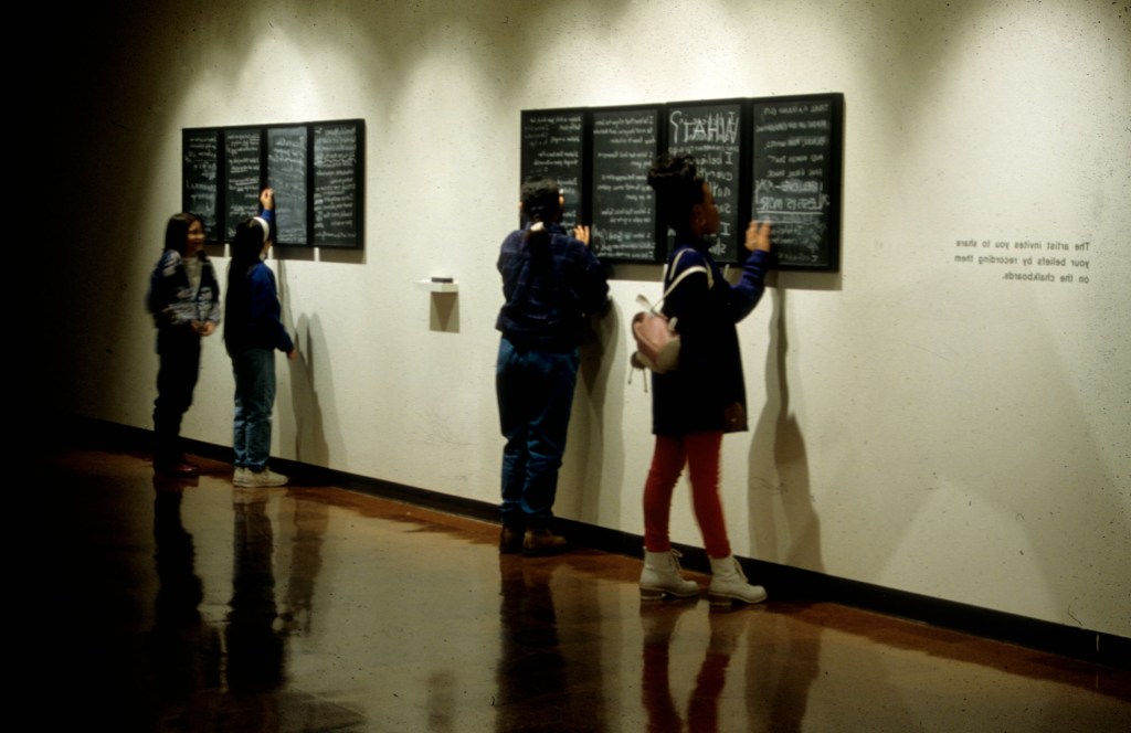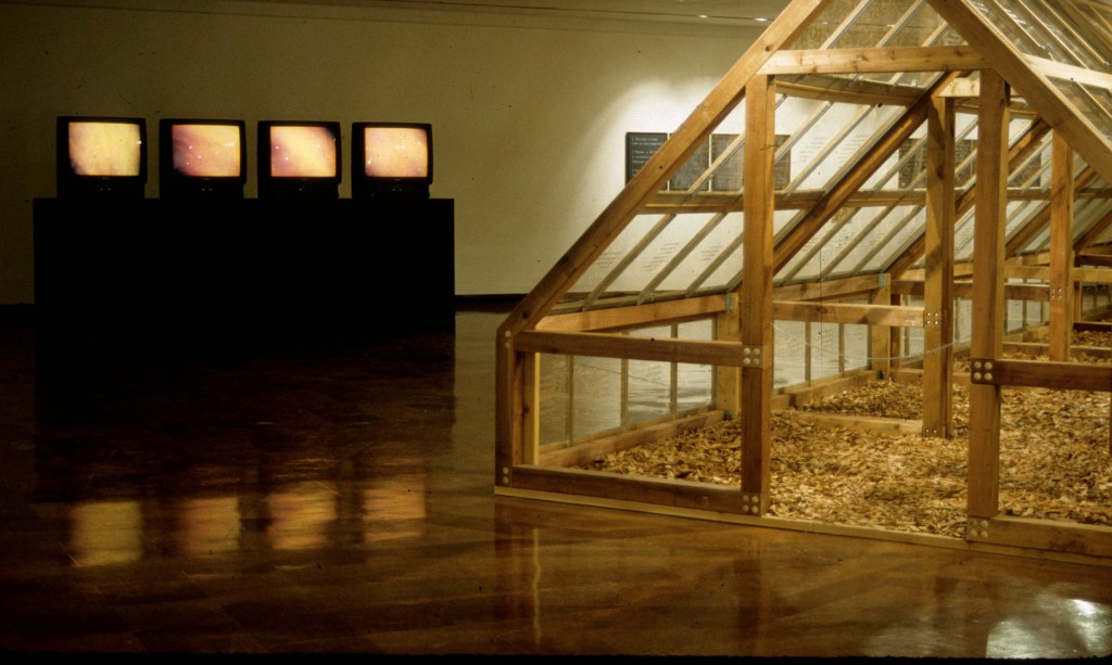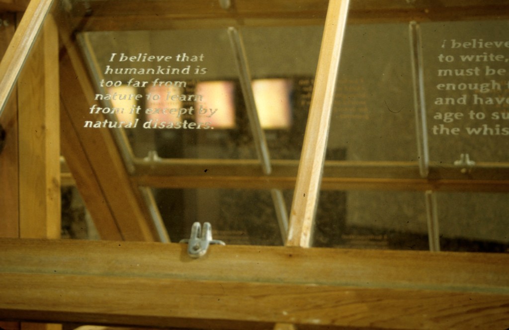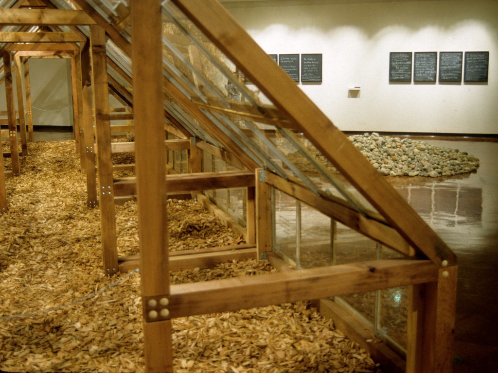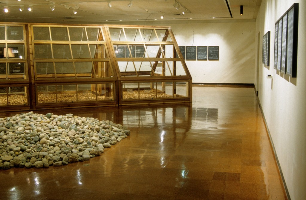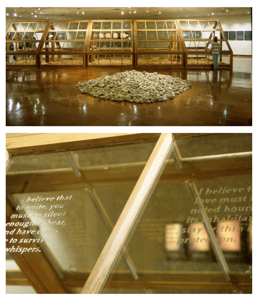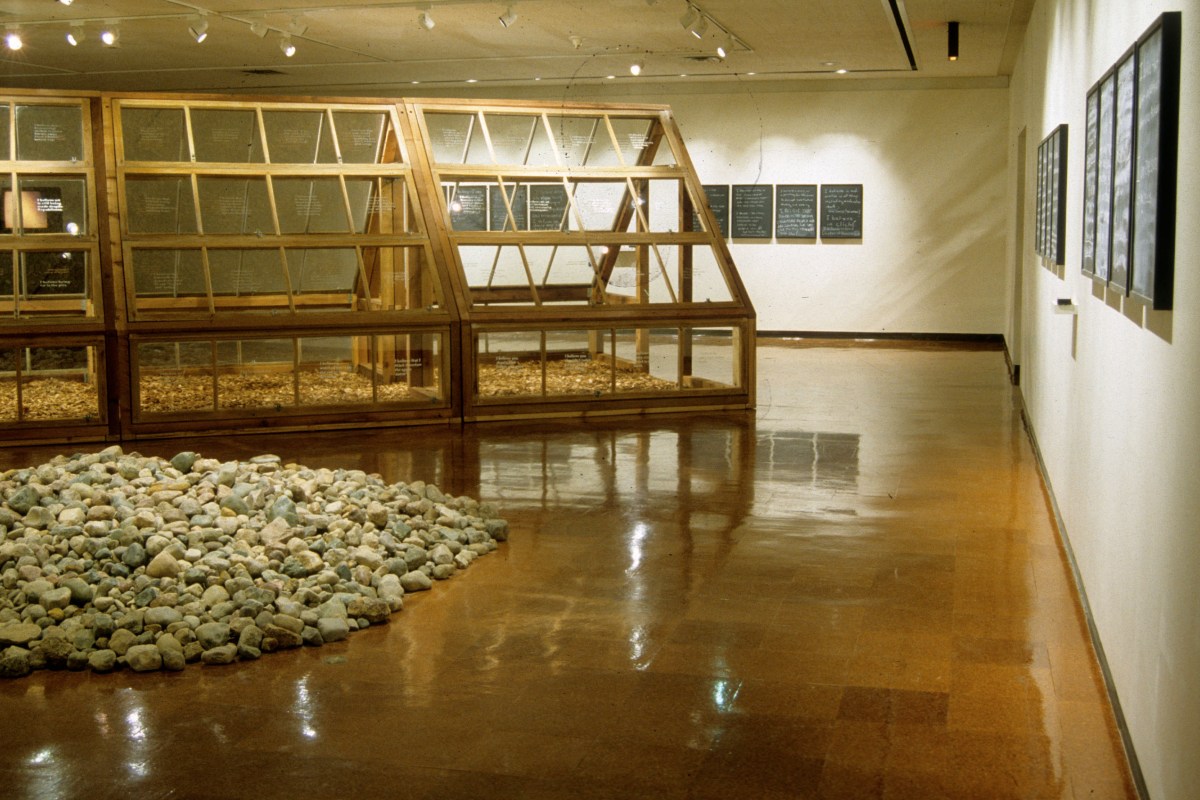This installation at the Flint Institute of Art dealt with the beliefs of the community. The windows on the greenhouse forms revealed the beliefs of 10 women artists. Chalkboards around the room gave visitors the option to add their own comments. Also notebooks on a table in the gallery provided additional space for beliefs to be recorded. The pile of rocks reminded viewers of the violence that can be associated with openly revealing ones beliefs. Video screens behind the greenhouse form played images of fire which was related to the recent burnings of African American churches.