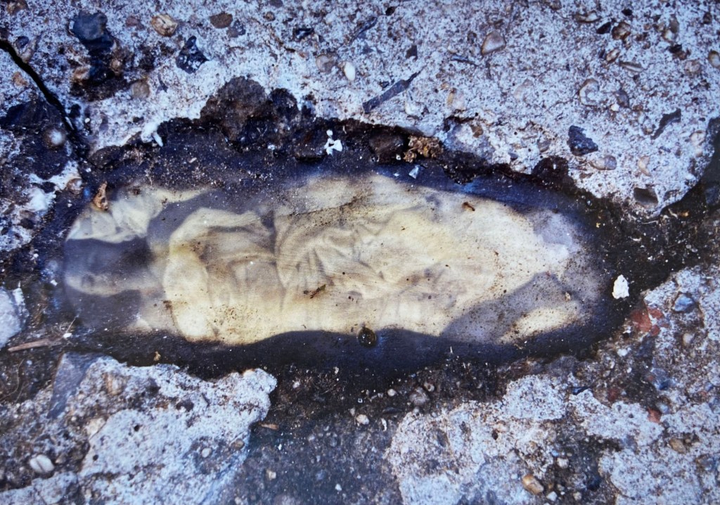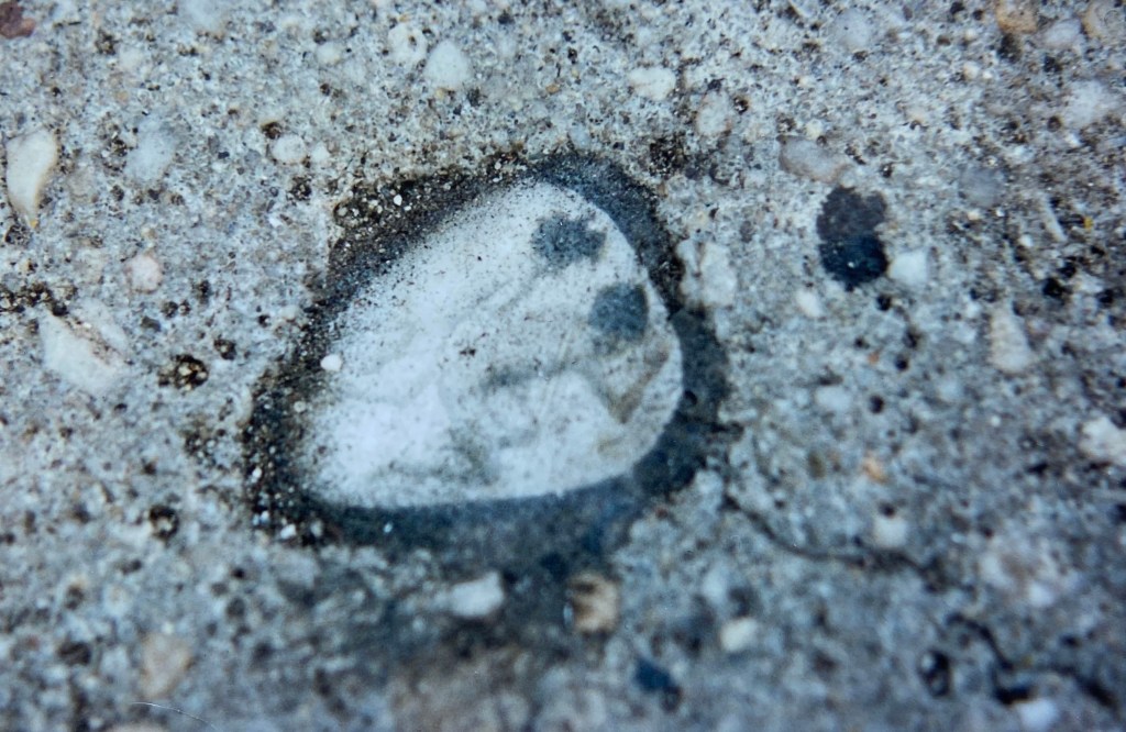 Within days, the one-inch diameter images disappeared into the inevitable grim. The next year we returned to embed larger images and many survived to be seen for a year or more. We liked the idea of making art in unusal places that could be discovered by chance. We noticed we had a “follower” when we saw that some resin-embedded photos appeared to have been dug up and taken away.