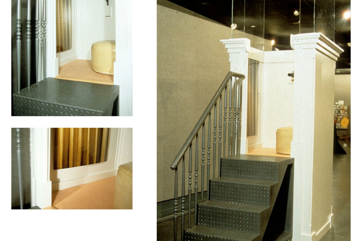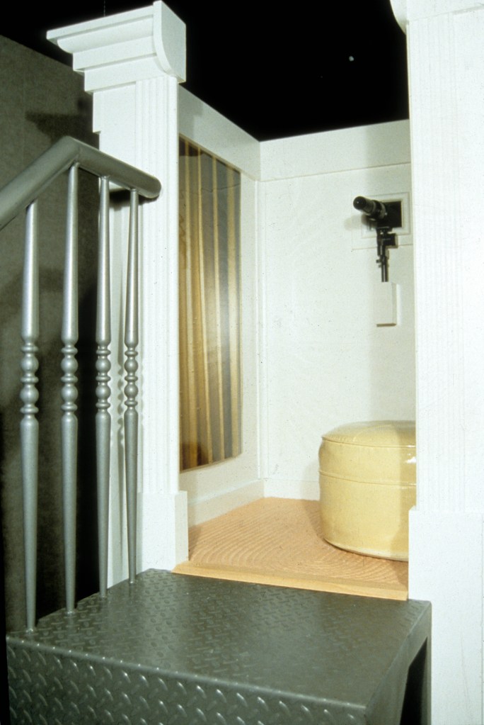 This piece was made specifically for the Kresge Art Museum in East Lansing, Michigan for the Michigan Biennial Exhibition. The large “vitrine” is big enough to enclose and isolate the viewer, who is then free to privately view artwork in the museum through a telescope. As the museum goer stands in the structure, they are both the viewer and the viewed. The previous viewing apparatus, built at the Mattress Factory in Pittsburgh, allowed the viewer to see inside the gallery without actually entering the space. This meant that residents in the community who might feel uncomfortable in an art space had the freedom to participate without actually having to enter the space. The structure of this piece protects in a similar way by creating a homelike atmosphere with rug, seat and curtains that could seem more comforting than the harsh lights and open spaces of the museum, despite the harsher materials those objects are made from (rubber, cement, plastic film.