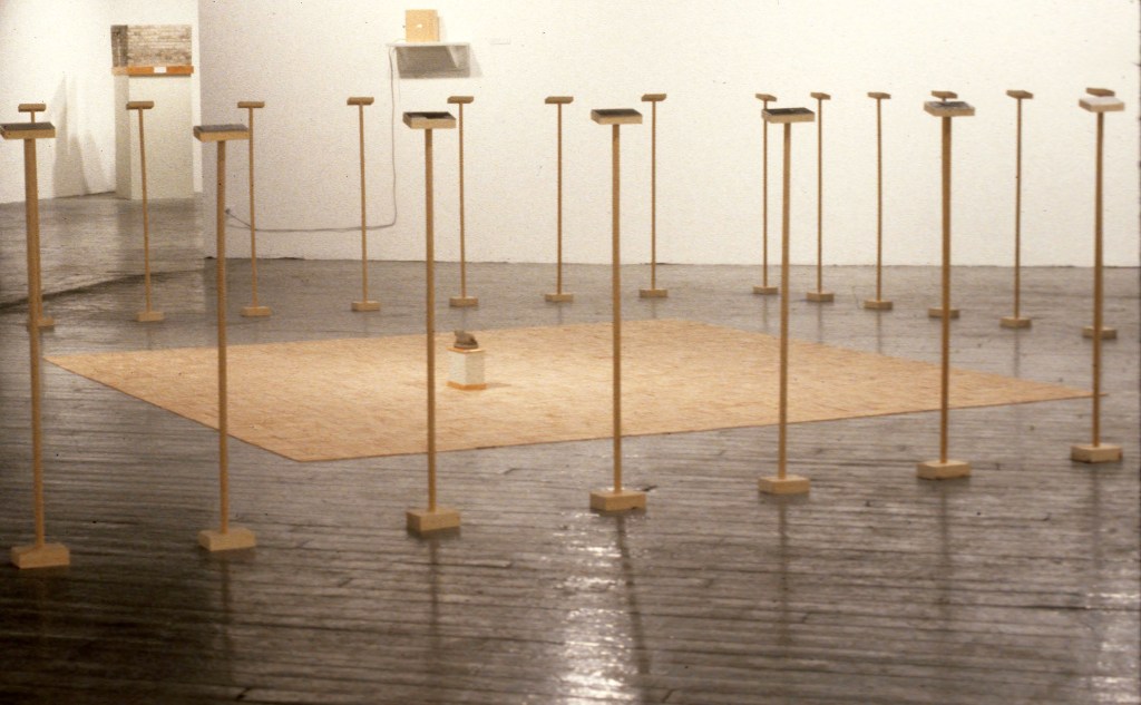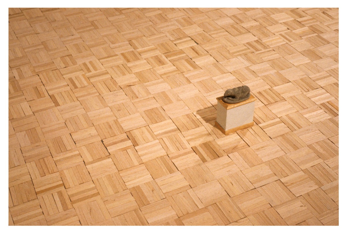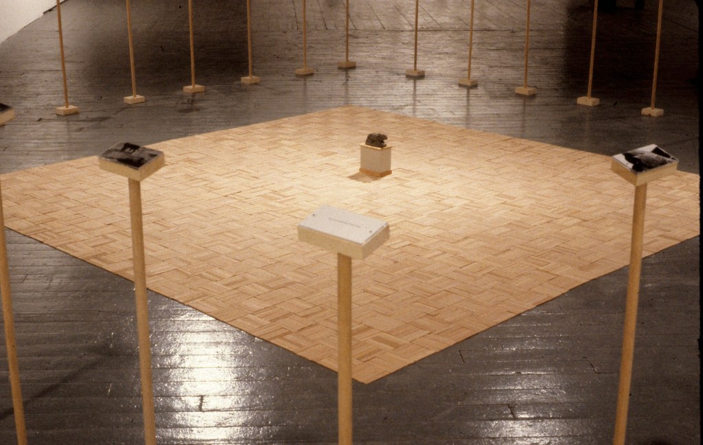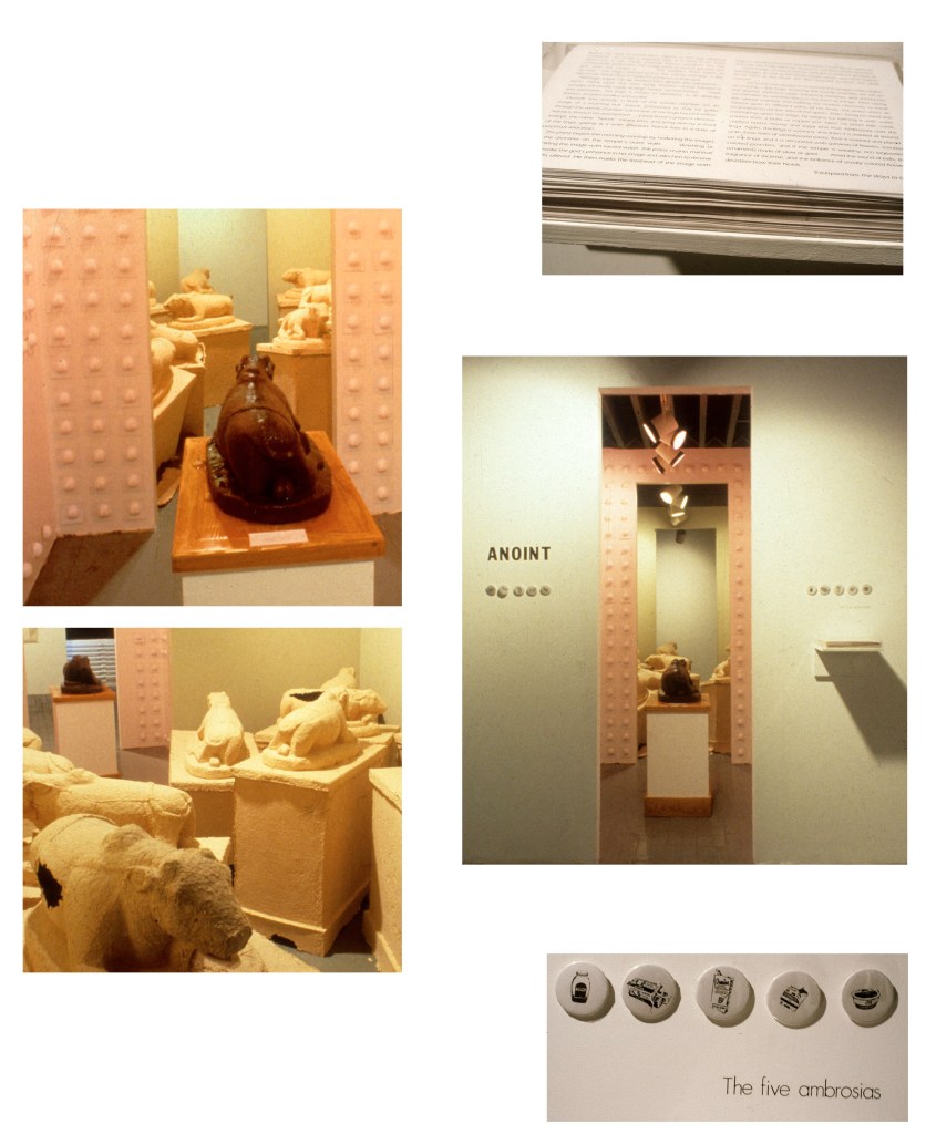 This work produces new environments for a sculpture from the Art Institute of Chicago collection—Stone Image of Nandi, Bull Mount of Siva, Java, 8th-9th century—which attempt to show how the positioning of this piece by the museum neuters (disempowers and displaces) and neutralizes (empties of meaning). The Nandi in the first room reverses the museum orientation—yet resembles that of a Siva temple where he would be approached from behind as he stares into the main temple, called the womb chamber, at the linga, a phallic representation of the god Siva. During the ritual in which Siva is persuaded to inhabit the linga so that he can be worshipped, the linga is bathed with the five ambrosias—honey, sugar, clarified butter, curds and milk. In the installation, Nandi stares into a room occupied by hollow imitations of his own form, and empty containers which once held the products we would associate with the five ambrosias are formed into phallic triplets and stored above Nandi’s sight.